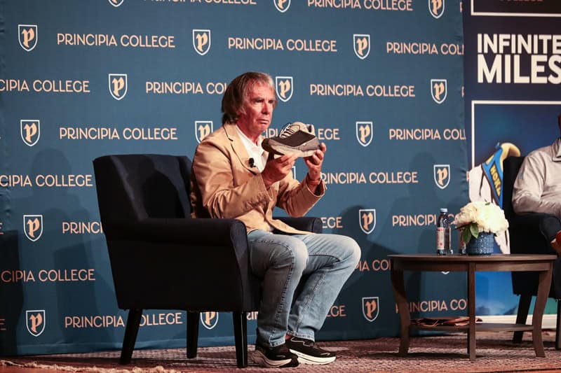 Diard holding the OG Hoka shoe. (Principia College)
